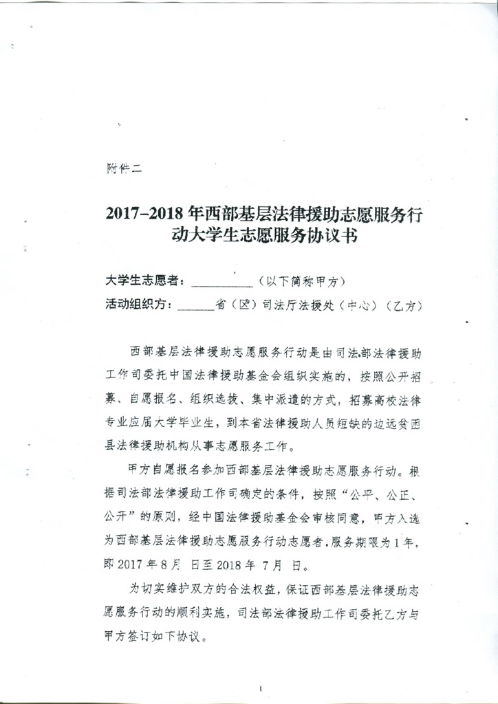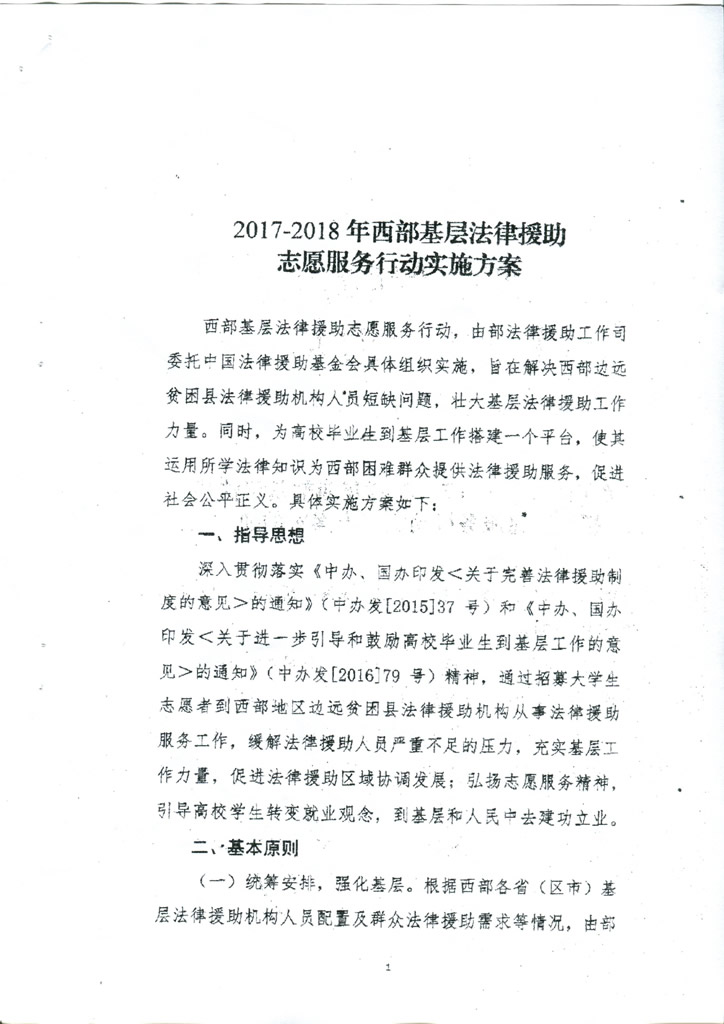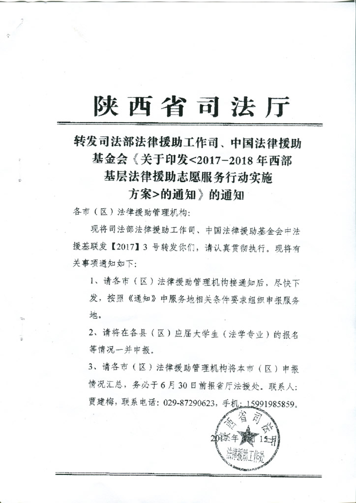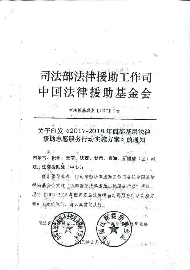 转发司法部法律援助工作司、中国法律援助基金会《关于印发<2017-201年西部基层法律援助志愿服务行动实施方案》的通知