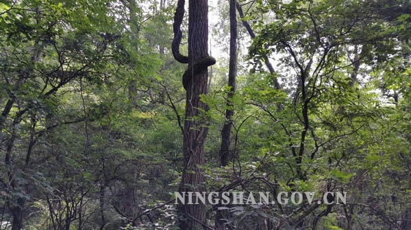 此行路上有两处景点:“七姊妹”和“一碗水”。去年徒步时曾错过了“一碗水”,这次不能再错过而留下遗憾。在队友渴求的目光中,在我极力的搜寻下,我终于在茂密的林子里找到了“七姊妹”。“七姊妹”是一棵古松,靠近地面处要3人才能勉强合围,树干约10米处分成两根,再往上又分成七根,挺拔修长,在四周树木的印衬下,只能看到树干而无法看到全貌,大家推测它至少500高龄,可依然保持着旺盛的生命力。因有七根树干,数百年而不显老态,我们当地人已经把它敬畏成神,美其名曰“七姊妹”。因科学知识的普及,关于它各种版本的传说已经在人们心中淡忘。大家一路前行,小溪绕着我们唱歌,路边的古木、巨藤比比皆是,处处都有景,队友说:“走在这样的林子里,一切烦恼皆随风而去,真的让人心旷神怡”。